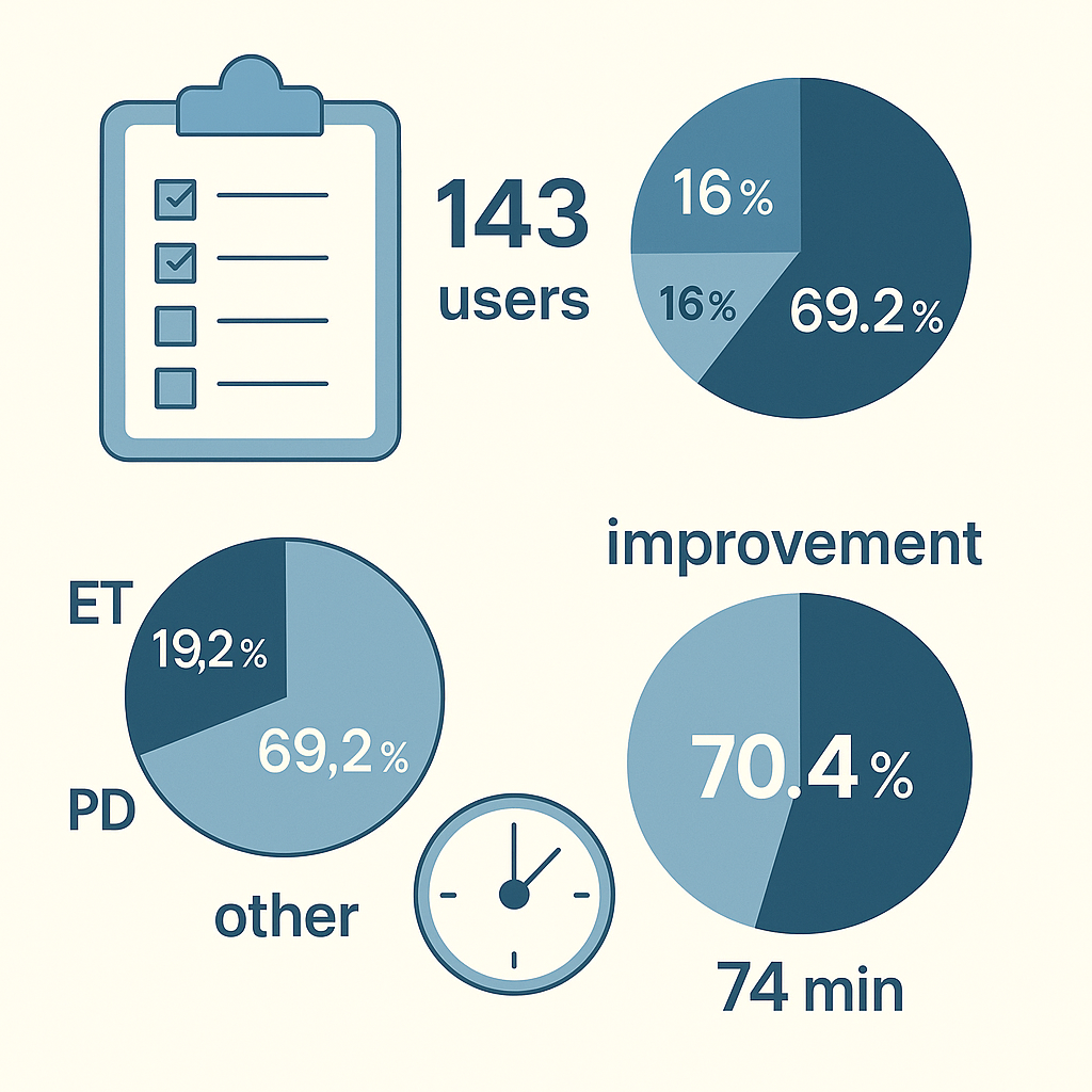 Dauguma respondentų sirgo esencialiniu tremoru (ET), 16 % – Parkinsono liga (PD), o 2,8 % turėjo kitų būklių. Iš viso 70,4 % vartotojų nurodė pagerėjimą – 74,4 % tarp Parkinsono ligos pacientų ir 69,2 % tarp esencialinio tremoro pacientų. Vidutinis terapijos poveikis truko apie 74 minutes (±15 min.)