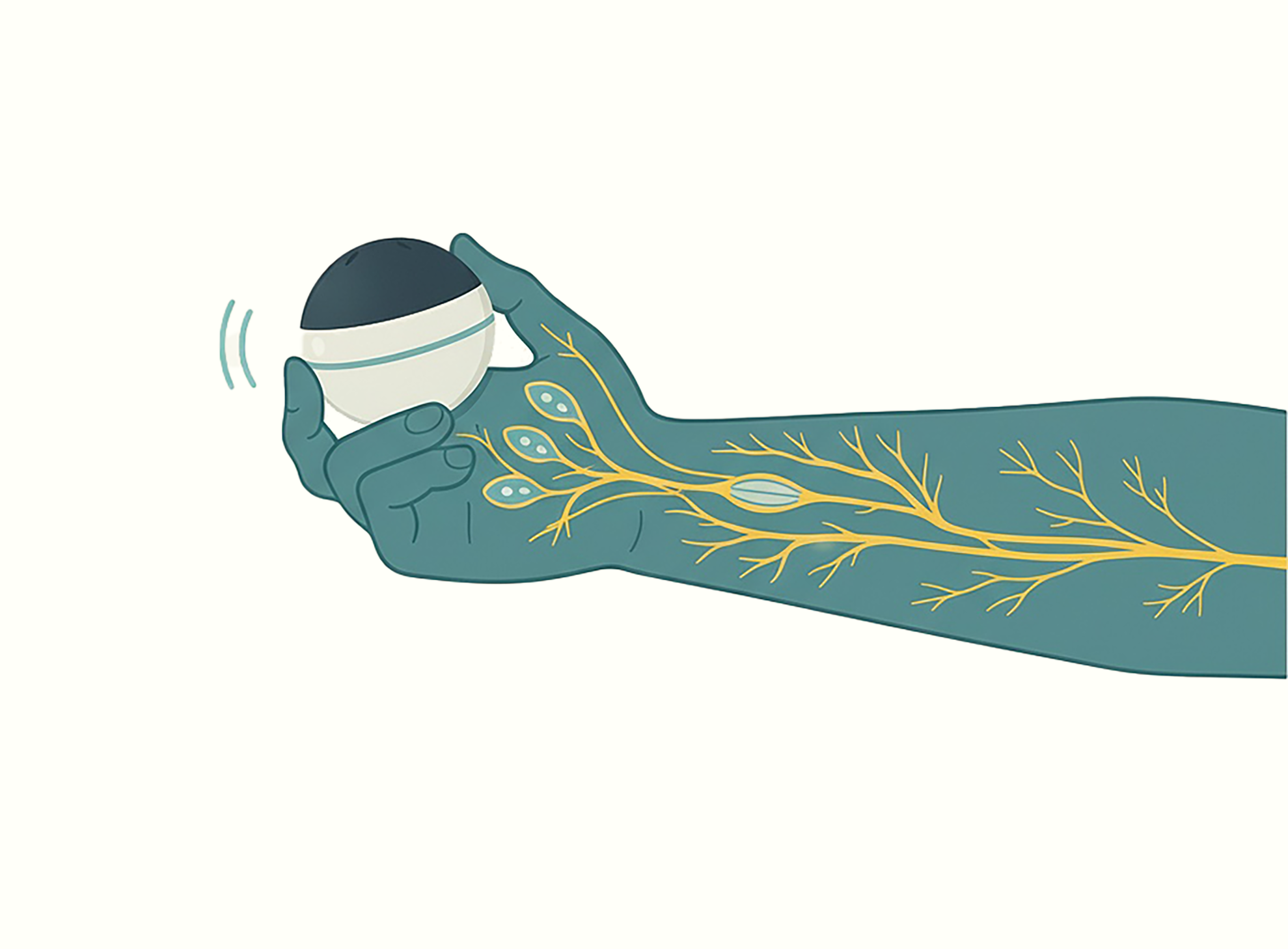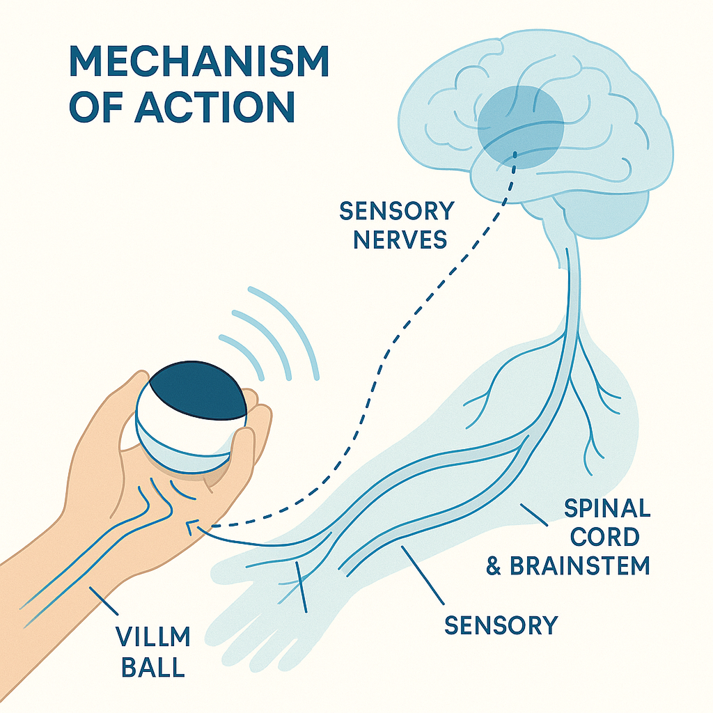 VILIM kamuoliukas veikia siųsdamas lėto ritmo impulsus per ranką, kuria jį laikote. Šie impulsai stimuliuoja smulkiuosius raumenis ir sausgysles, todėl galūnė tampa mažiau linkusi „atkartoti“ savo drebėjimą. Tuo pačiu metu vibracija apkrauna jutiminius nervus, kurie paprastai perduoda prisilietimo, sąnarių padėties ir judėjimo signalus. Ši informacijos srovė paverčiama elektriniais signalais ir pasiekia nugaros smegenis bei smegenų kamieną. Tokie signalai slopina ir iš dalies blokuoja netaisyklingus impulsus, sukeliančius esminį drebulį.