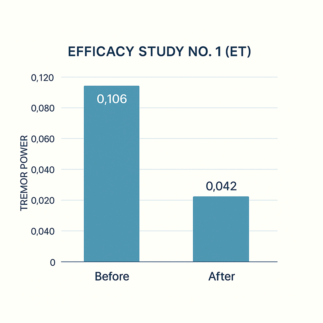 - ULTRE tyrimas (2025 m.) – dvigubai aklas, placebo kontroliuojamas kryžminio dizaino tyrimas, kuriame dalyvavo 47 esencialiniu tremoru sergantys asmenys, parodė, kad ant riešo dėvimas vibracinis prietaisas reikšmingai sumažino drebėjimą ir buvo gerai toleruojamas.
