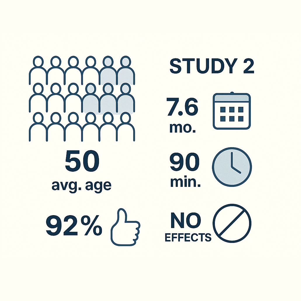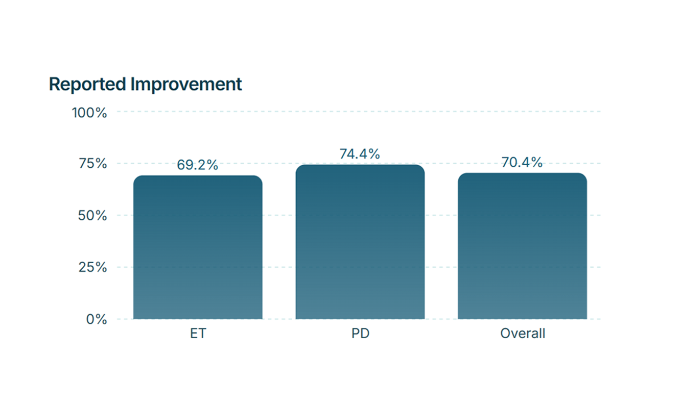 Dauguma jų sirgo esencialiniu tremoru (ET), 16 % turėjo Parkinsono ligą (PD), o 2,8 % – kitas būkles. Iš viso 70,4 % apklaustųjų pranešė apie pagerėjimą – 74,4 % tarp Parkinsono ligos pacientų ir 69,2 % tarp esencialinio tremoro pacientų. Vidutiniškai terapijos poveikis jautėsi apie 74 minutes (±15 min.)