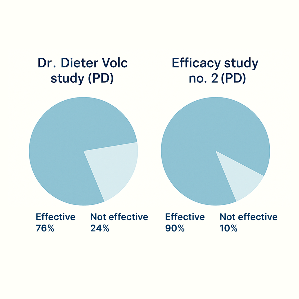 kamuoliuko naudojimo. - Vykstantis tyrimas (Dr. Dieter Volc): iki šiol 19 iš 25 Parkinsono drebulį turinčių dalyvių parodė pagerėjimą. Išsamūs rezultatai bus paskelbti netrukus.